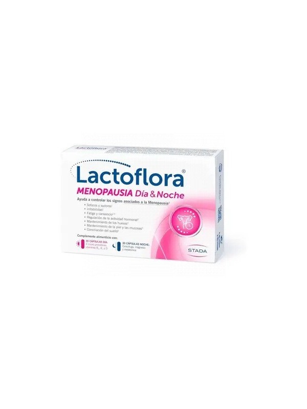 Lactoflora® menopausia día & noche es un complemento alimenticio formulado específicamente para la etapa de la menopausia y perimenopausia, aportando alivio y confort durante este periodo de cambio. Contiene una exclusiva mezcla de probióticos patentados, extractos de origen vegetal, vitaminas y minerales que ayudan a controlar los signos asociados a esta etapa. Lactoflora® menopausia día & noche está formulado en cápsulas color rosa para el día y color azul para la noche.